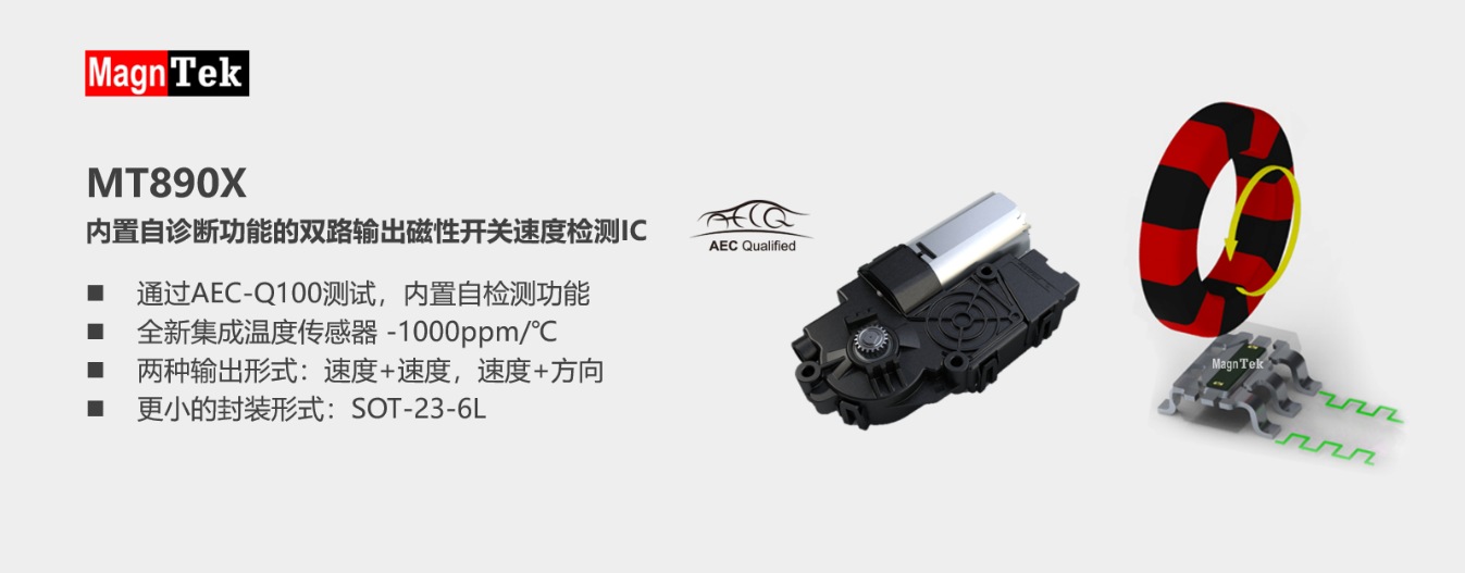 The IC MT890X series is an upgrade to the MT1452-EN series, the third generation of the latest speed directional latch switches from Magntek. The product is used in automobile motor system, such as sunroof, window anti-clamping motor, etc.